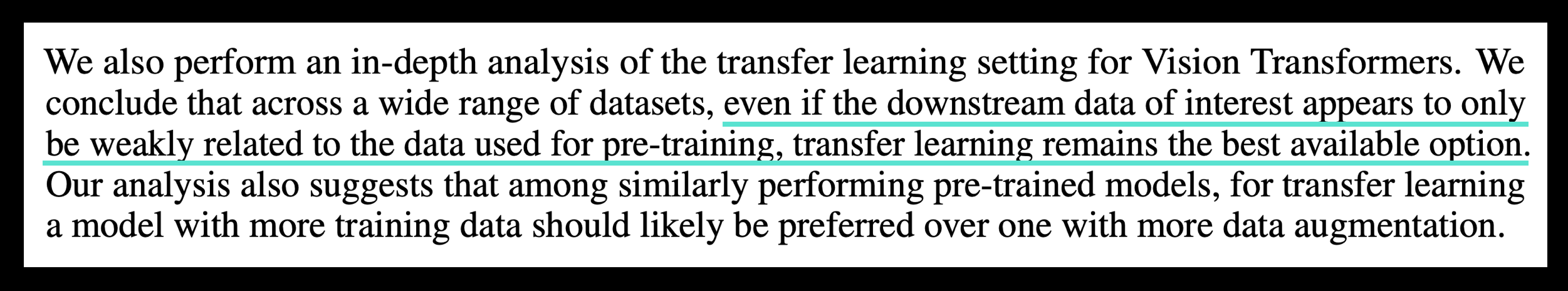 A study into the effects of whether training from scratch or using transfer learning was better from a practioner’s point of view, found transfer learning to be far more beneficial in terms of cost and time. Source: How to train your ViT? Data, Augmentation, and Regularization in Vision Transformers paper section 6 (conclusion).
