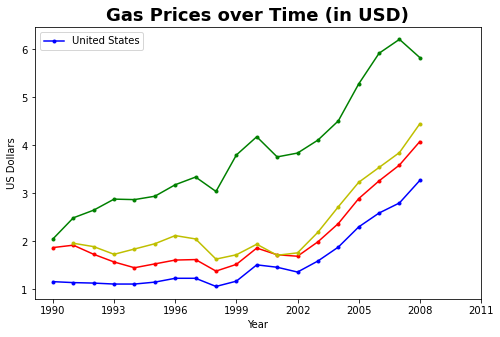 plt.title('Gas Prices over Time (in USD)', fontdict={'fontweight':'bold', 'fontsize': 18})
