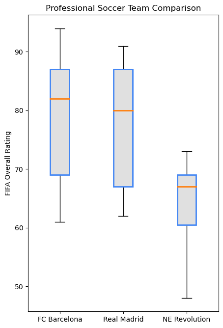 bp = plt.boxplot([barcelona, madrid, revs], labels=['FC Barcelona','Real Madrid','NE Revolution'], patch_artist=True, medianprops={'linewidth': 2})