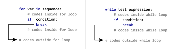 breakstatement provides you with the opportunity to exit out of a loop when an external condition is triggered, and the program control transfer to the next statement following the loop.If the